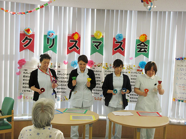 患者さんと一緒に、きよしこの夜の合唱やジェスチャーゲーム、ハンドベルの演奏などを行いました。